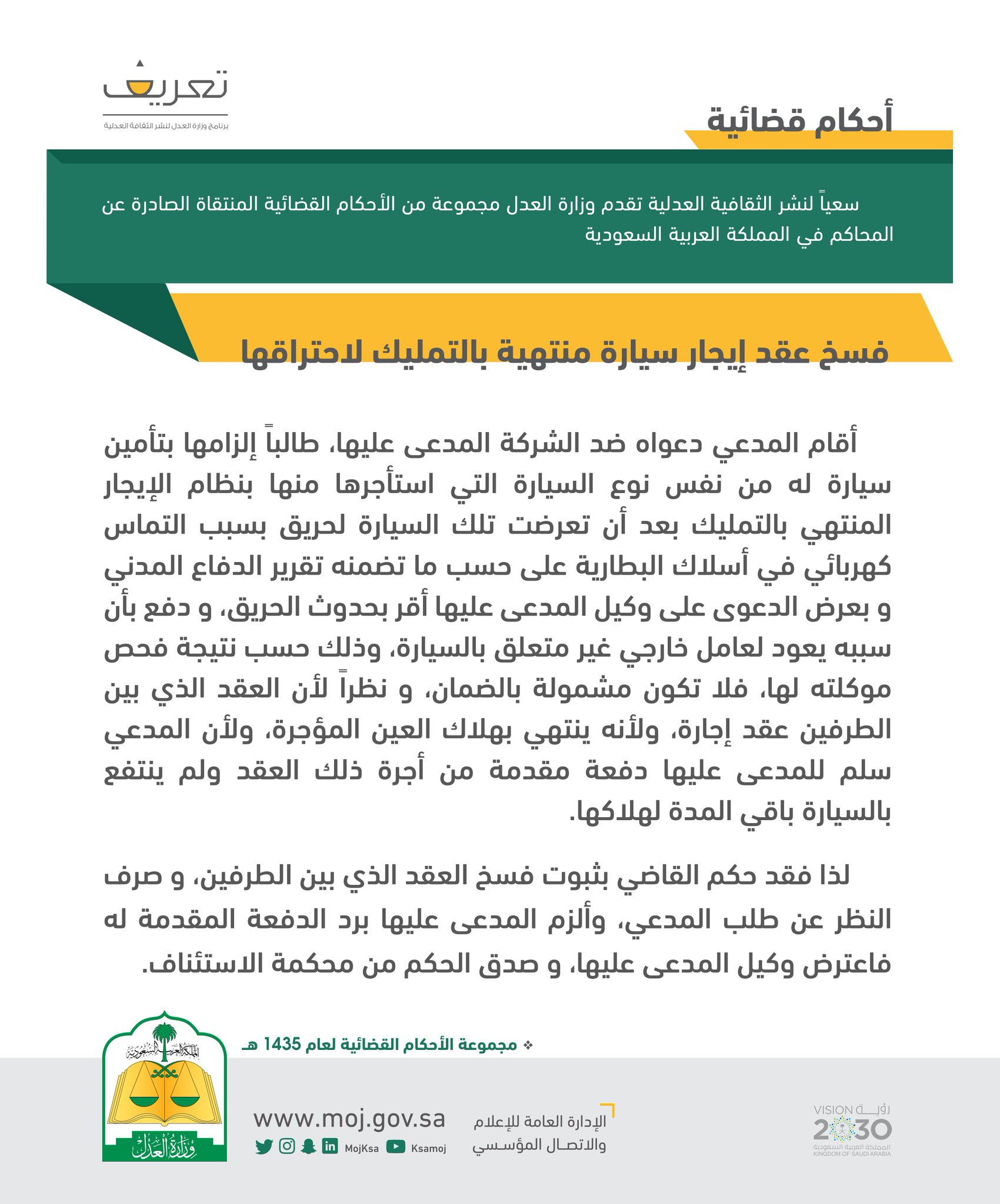 وزارة العدل En Twitter فسخ عقد إيجار سيارة منتهية بالتمليك لاحتراقها